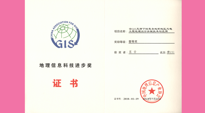 近日,由我院葛莹教授主持完成的“云GIS支持下的复杂地形地区风电工程地理设计关键技术与应用”荣获2018地理信息科技进步奖一等奖。