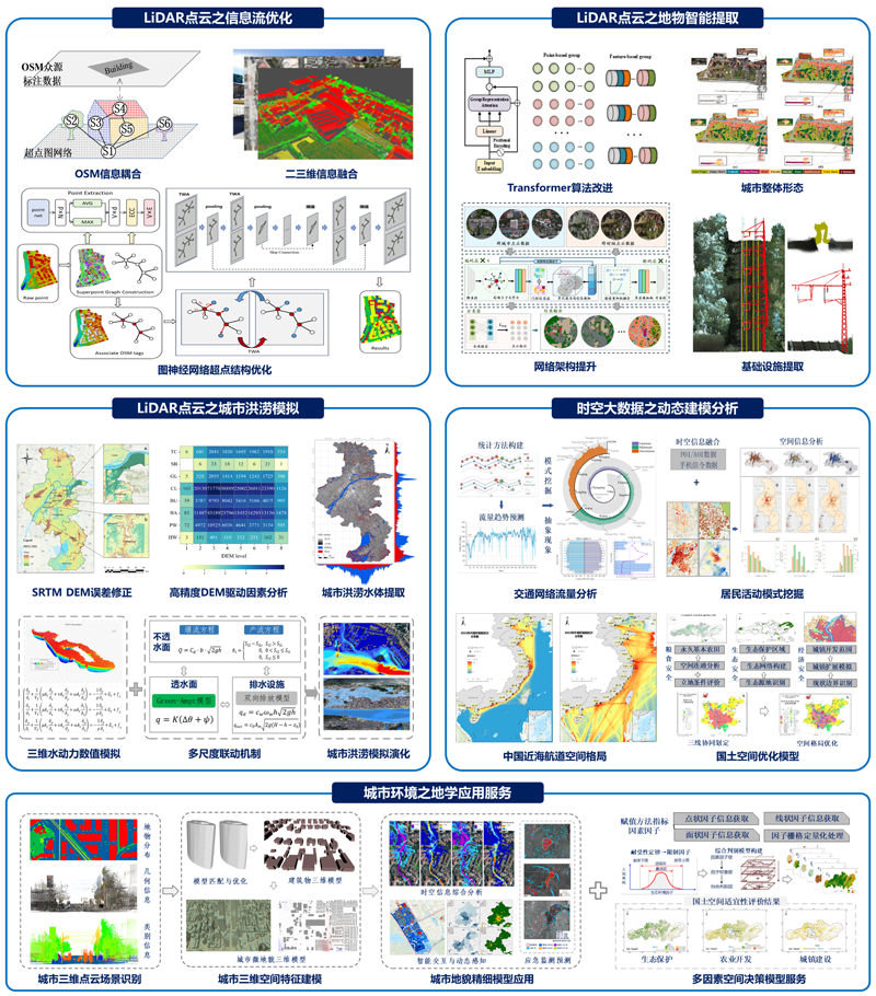 研究方向:致力于发展以LiDAR信息智能感知为核心、时空大数据分析为驱动的城市空间治理新模式,重点开展多模态数据融合、目标智能识别、时空特征建模、大数据分析、地学应用服务等方面的研究,形成“数据耦合→要素感知→时空分析→综合治理”研究框架。
