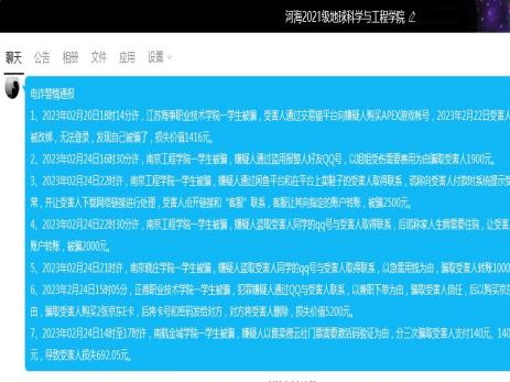 学院将防诈骗工作融入进日常工作中,每周依托“平安江宁”、“南京反诈中心”等公众号发布的防诈骗信息,在年级群进行转发宣传,时刻提醒同学们提升防诈骗意识。