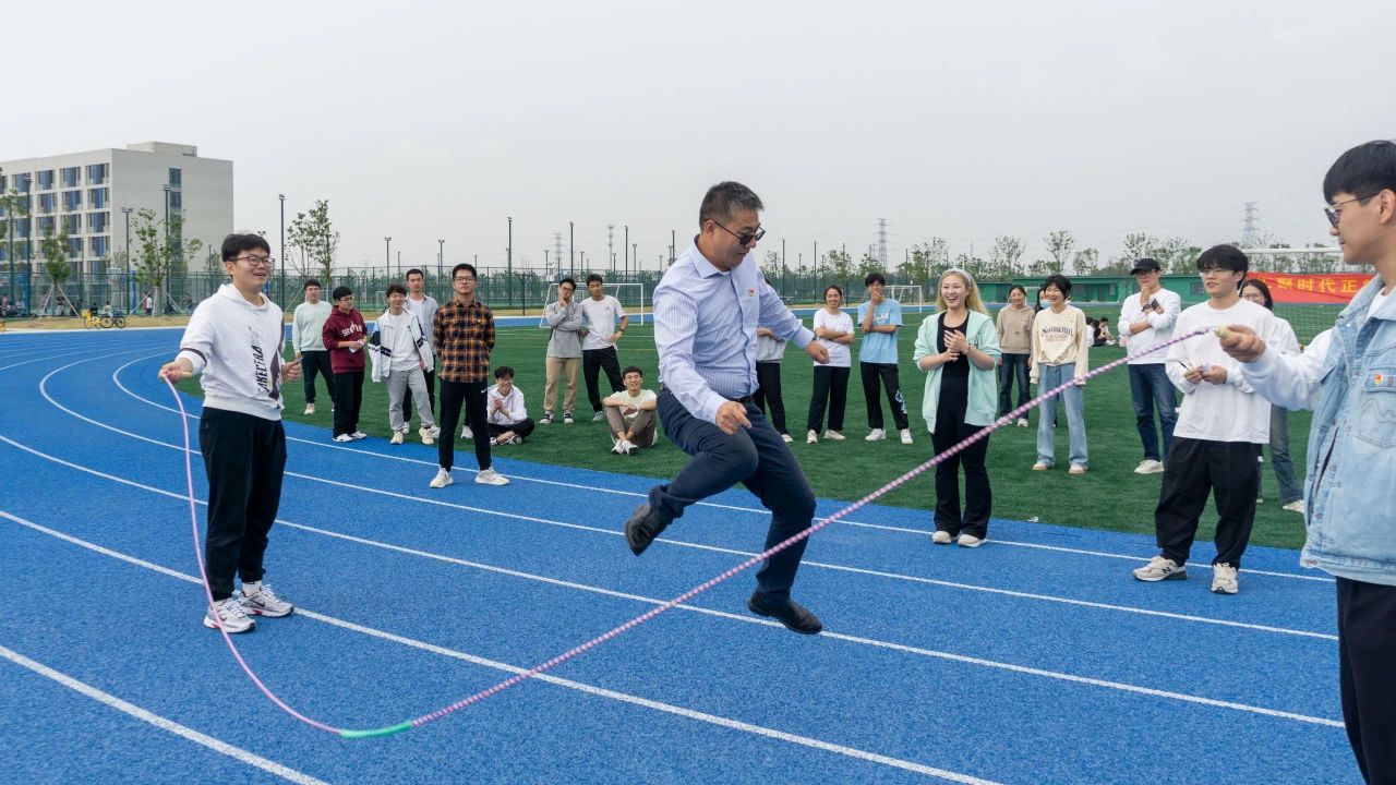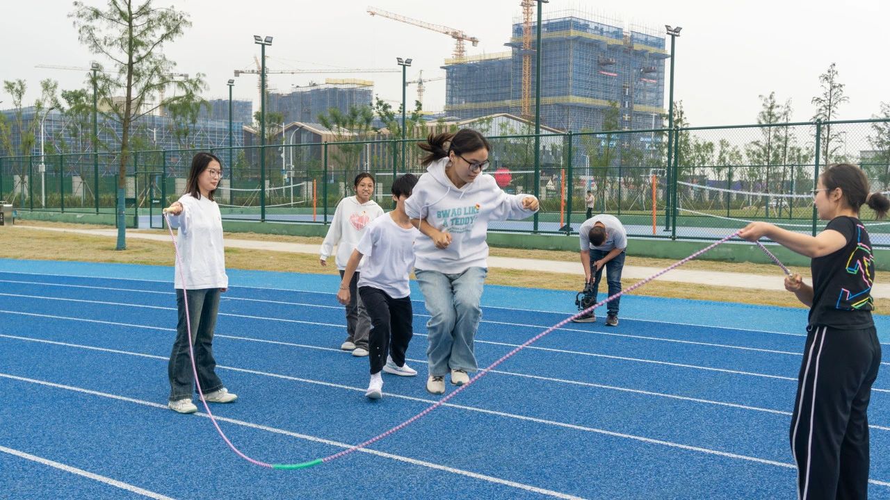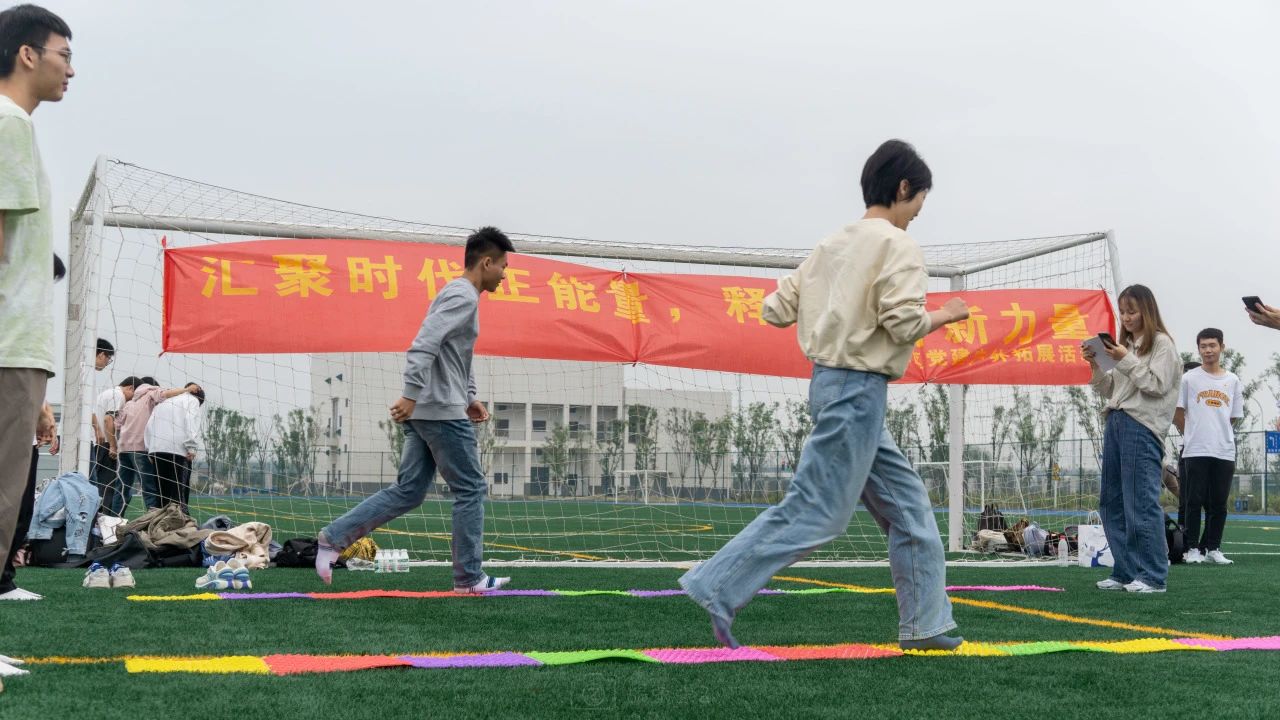 热身环节结束后,全体同学开始了趣味运动项目。共分为八支队伍,分别进行你画我猜、重走峥嵘路、两人三足、八字长绳等运动项目。