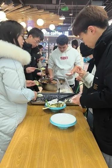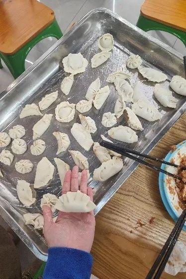 下午4:30,食堂工作人员将食材准备完毕,同学们纷纷加入到包饺子的行动中来。活动现场气氛温馨和谐,大家积极参与,互相传授包饺子的经验,各自展示自己包出的形态多样的饺子,一个个饺子以元宝状、月牙状等各种创意形式整齐有序地排列在一起。饺子出锅后,同学们围坐并一起品尝。