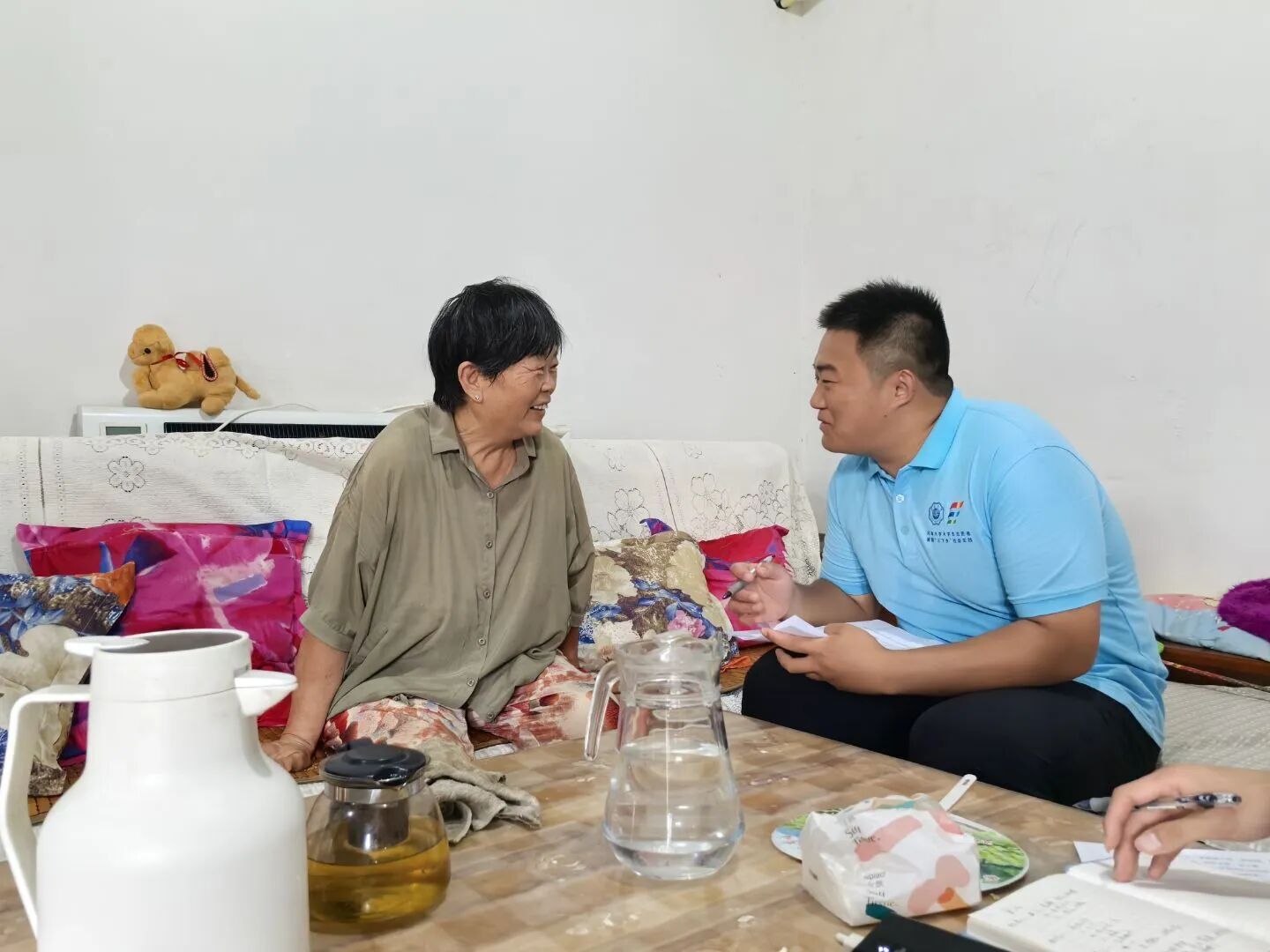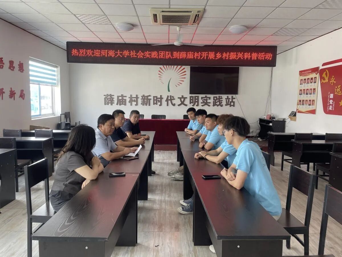 在村党群服务中心的座谈会上,实践团与唐山镇镇长、环保局科长、田书记及薛庙村党支部书记等村镇领导进行了深入交流。通过50分钟的座谈了解到,薛庙村在环保工作方面成效显著:光伏发电项目通过盘活闲置资源已实现户均年增收3000余元;垃圾分类采取分区管理+集中处理模式,设立专门回收点和督导员制度;村里通过党支部+合作社管理模式,将环保工作纳入村规民约。