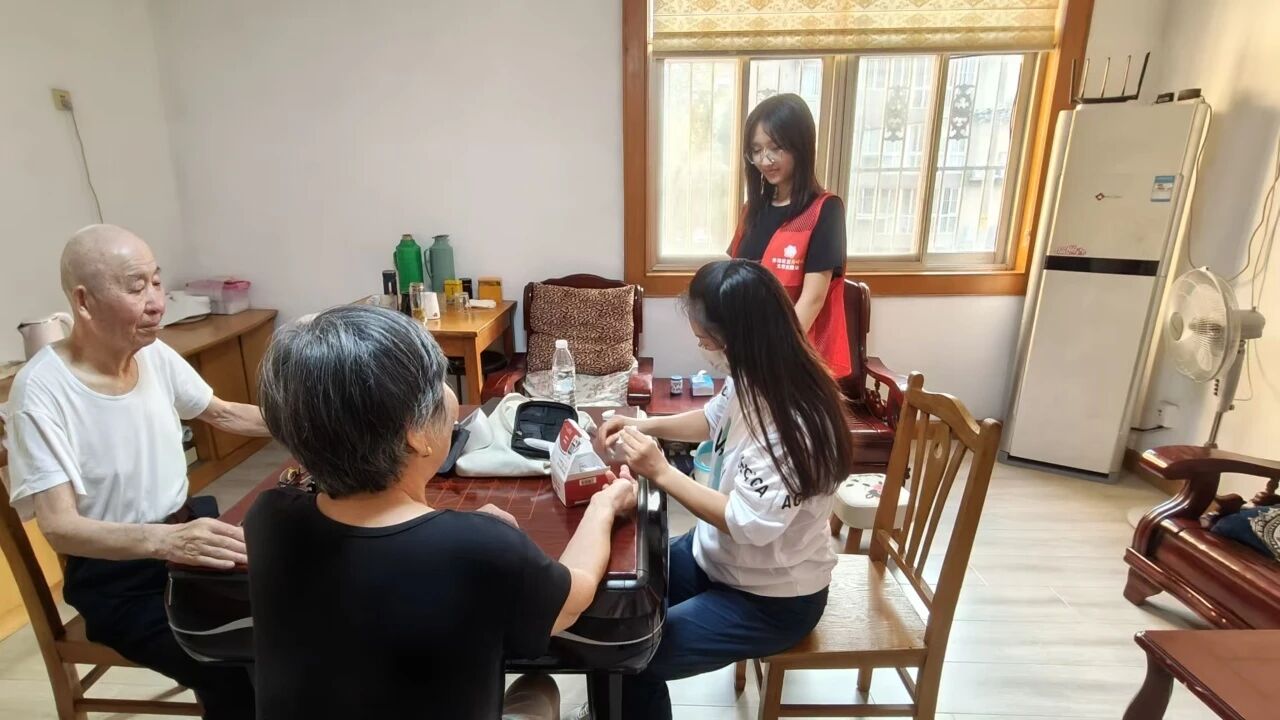在东新北路100号小区张奶奶家中,志愿者一边轻声安抚,一边熟练地将血压仪袖带缠绕在老人手臂上。此次实践中,团队成员以入户服务为主要形式,逐户为行动不便的老人提供血压、血糖、血氧等基础健康指标监测。面对部分老人视力模糊、听力减退的情况,志愿者们特意放慢语速,用 “拉家常” 的方式询问老人日常饮食、睡眠及用药情况,结合检测结果给出 “少盐少糖、规律作息” 等个性化健康建议。