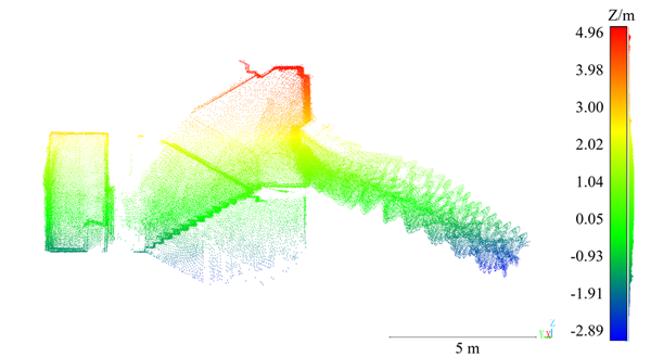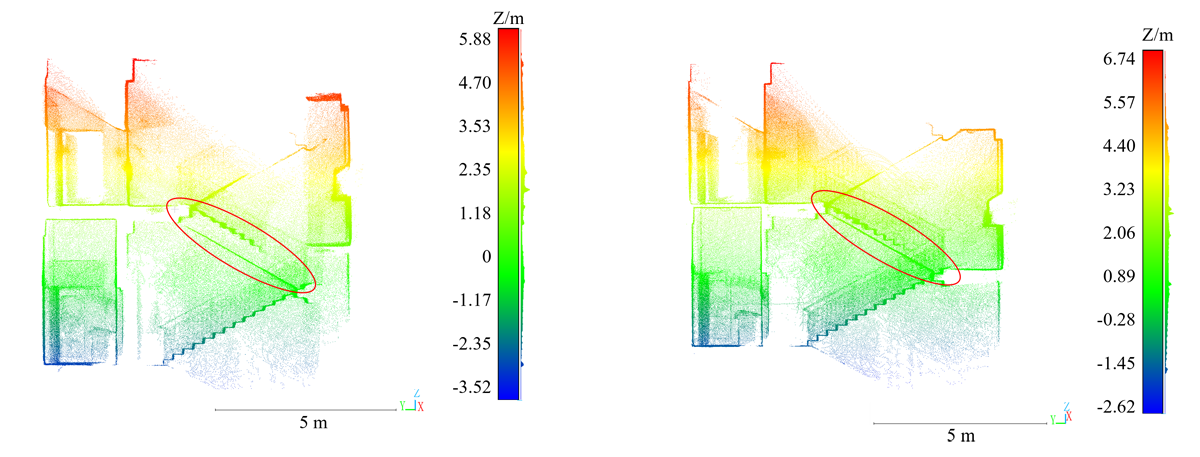 研究团队使用头盔式激光扫描系统在典型室内外场景采集了四个序列数据,与现有激光惯性里程计方法和后端优化方法进行对比验证,充分验证了DALI-SLAM方法的有效性。结果表明,该方法前端部分与基于滤波器的SOTA方法FAST-LIO2相比,轨迹的均方根误差分别减少了53.9%、35.1%和7.9%;该方法后端部分分别将轨迹误差进一步降低了25.2%、9.2%和52.4%。在序列4上三维建图对比结果见图2。