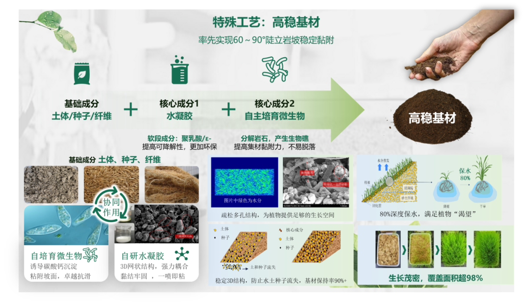 该项目团队针对原有边坡生态修复技术存在的适用坡度小、基材易流失、修复效果差等问题,积极开展跨学科创新研究,自主研发可降解环保水凝胶,自主培育微生物,独创配比适用于陡立岩坡生态修复的高稳基材,为陡立岩质边坡生态治理提供定制化专业修复方案,助力国家“双碳目标”达成。