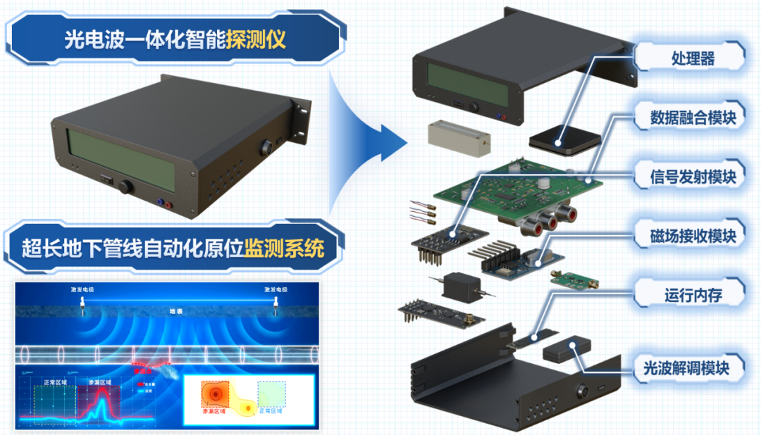 针对超长地下管线渗漏探测难题,团队提出了光电波精细化探测技术,自主研发了光电波一体化智能探测仪,建立了自动化原位监测系统,解决了长距离传输信号衰减强、渗漏定位差和预警监测难的技术痛点,实现了超长地下管线全生命周期高精度智能化探测,助力工程安全稳定运行。